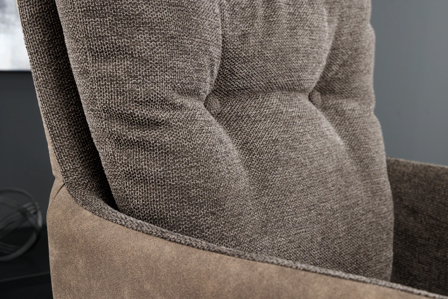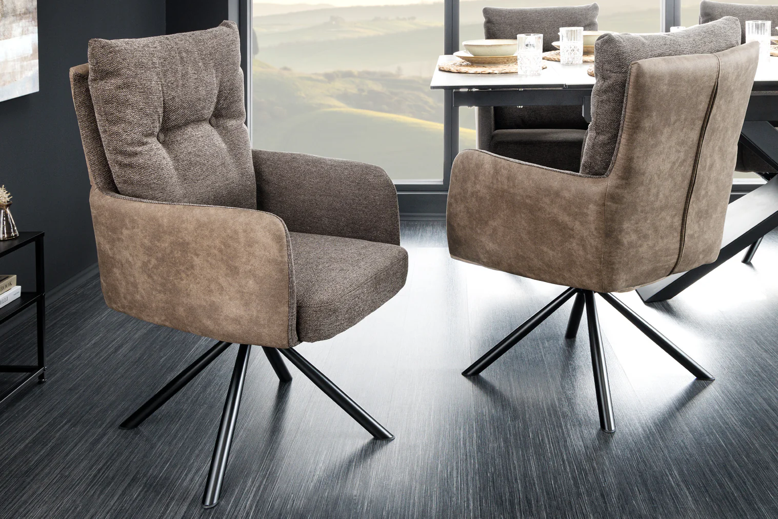 Veľké otočné kreslo zo série Big George. Toto pohodlné kreslo je skutočným pútačom pozornosti. Otočné sedadlo o 360° je vybavené vysoko kvalitnými taštičkovými pružinami a pohodlne polstrovaným operadlom, ktoré je ďalej doplnené ozdobnými gombíkmi. Vnútorná časť je čalúnená modernou plochou tkaninou, zatiaľ čo vonkajšia strana je potiahnutá ľahko udržiavateľnou textúrovanou látkou. Nohy z čierneho kovu v retro štýle dotvárajú výnimočný dizajn stoličky. Vďaka nadčasovému a jednoduchému dizajnu môžete túto otočnú stoličku ľahko kombinovať s rôznymi štýlmi interiéru a umiestniť ju k akémukoľvek stolu, ktorý si vyberiete. Či už k veľkému jedálenskému stolu z masívneho dreva, alebo ako štýlovú pracovnú stoličku k vášmu retro stolu, táto pohodlná stolička vždy vyzerá skvele a zostáva pohodlná aj po mnohých hodinách sedenia.