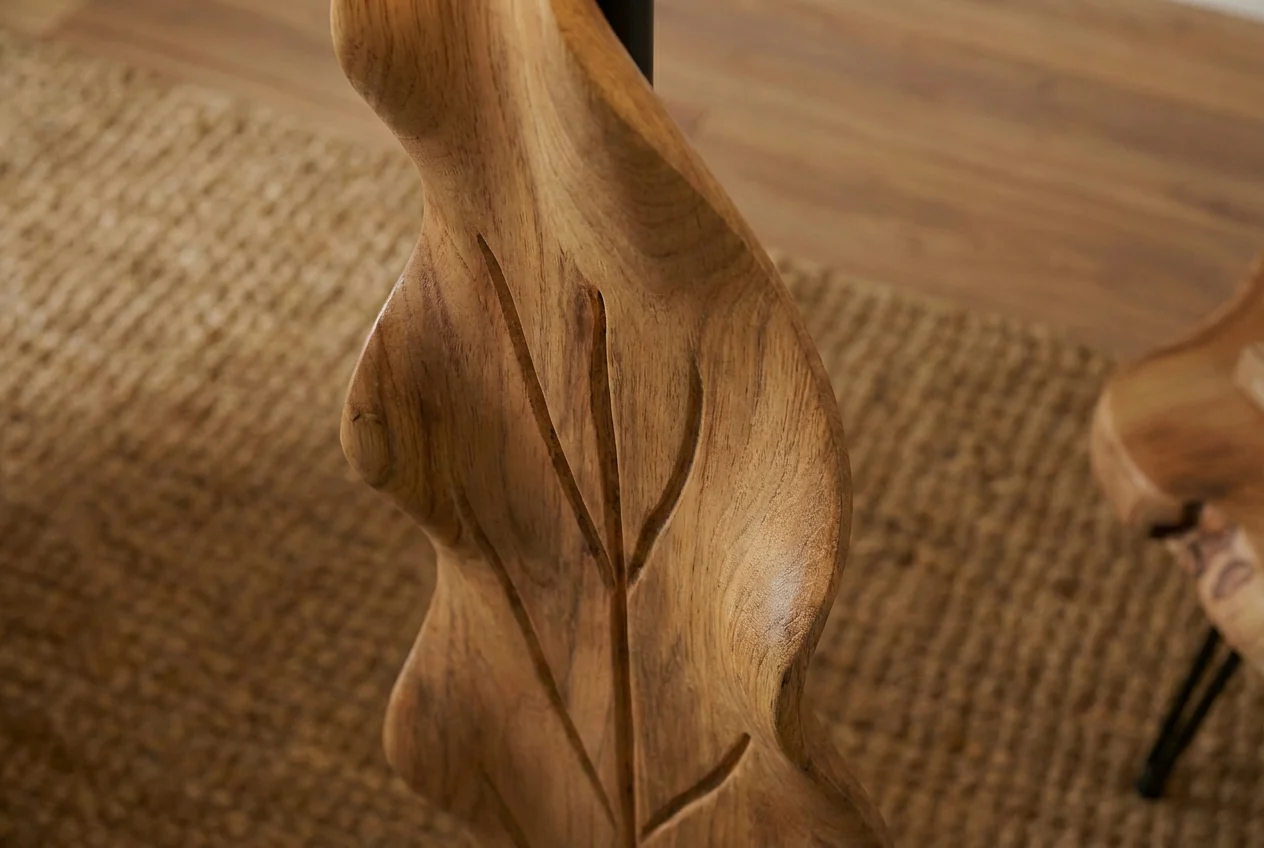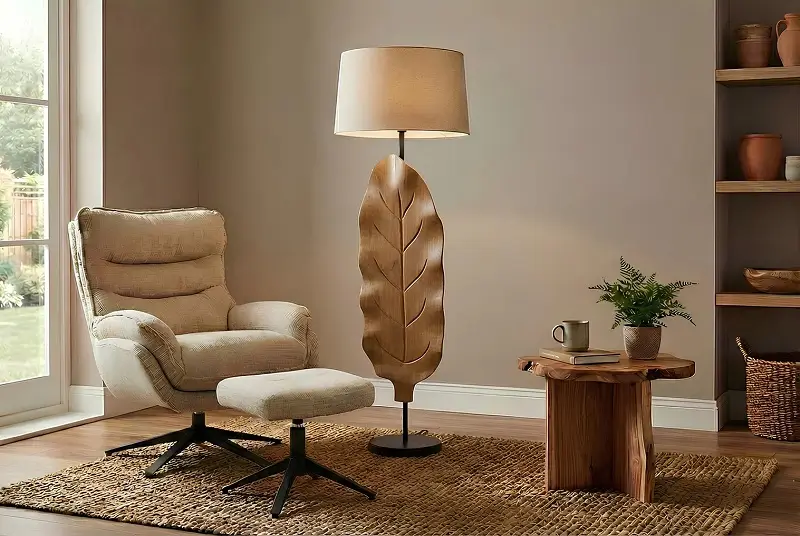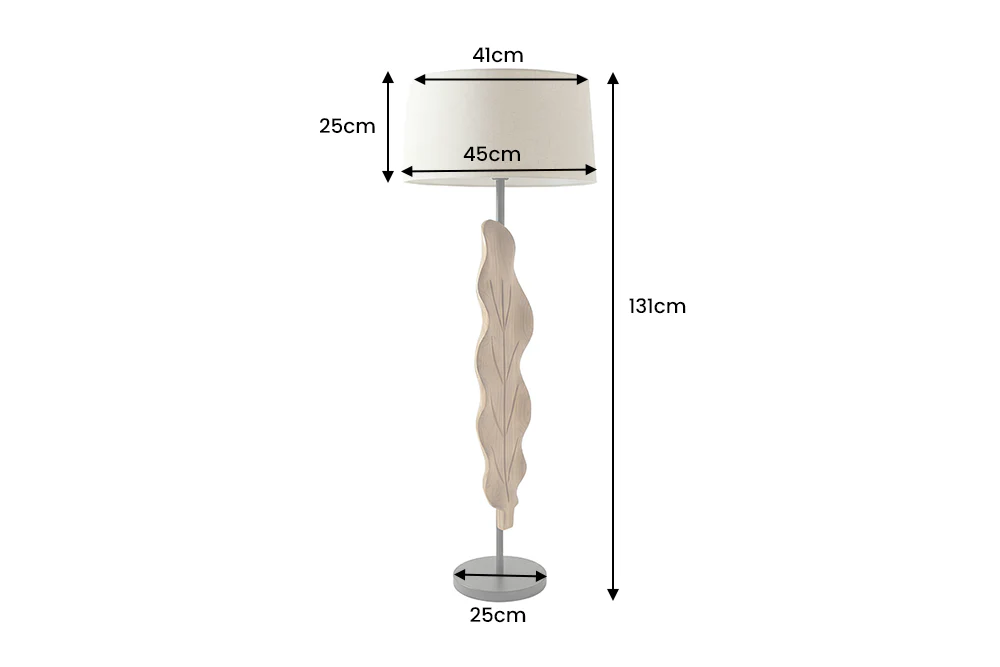 Vysoká stojacia lampa zo série LEAF. Táto lampa prináša krásu prírody priamo do vášho domova. Jej umelecky spracované telo/dekorácia lampy v tvare pevného, štylizovaného listu z nej robí výnimočný dizajnový prvok s teplým, organickým charakterom. Detailná štruktúra dekorácie listu dodáva lampe živý vzhľad a vytvára harmonickú zmes prírodného dizajnu a modernej interiérovej estetiky. Klasické krásne tienidlo štýlovo dopĺňa dizajn a vytvára príjemne mäkké, neoslňujúce svetlo – ideálne ako stojacia lampa do obývačky, atmosférické osvetlenie v spálni alebo ako dekoratívny akcent na chodbe. Robustný rám zaisťuje stabilitu, zatiaľ čo kombinácia teplých drevených tónov a nadčasového tvaru ju robí dostatočne všestrannou na to, aby doplnila rôzne štýly interiéru, či už od moderného a boho až po prírodné koncepty bývania. Sfarbenie tienidla závisí od použitej žiarovky, či už so žltým svetlom, alebo bielym svetlom.