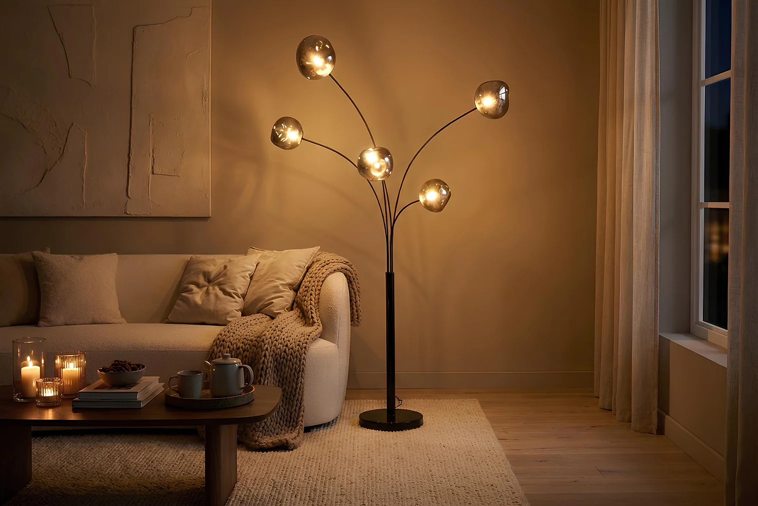 Vysoká stojacia lampa zo série Liquid. Stojanová lampa je štýlovým doplnkom, ktorý kombinuje moderný dizajn s útulnou atmosférou. Štíhly čierny kovový rám pôsobí elegantne a ľahko, zatiaľ čo päť dymovosivých sklenených tienidiel jemne filtruje svetlo a vytvára obzvlášť teplú a rozptýlenú žiaru. Výsledkom je sofistikovaná hra svetla, ktorá okamžite spríjemní každú miestnosť – ideálna do obývacích izieb, spální alebo moderného čitateľského kútika. Jas tienidiel ovplyvňuje výber žiaroviek s bielym alebo žltým svetlom.