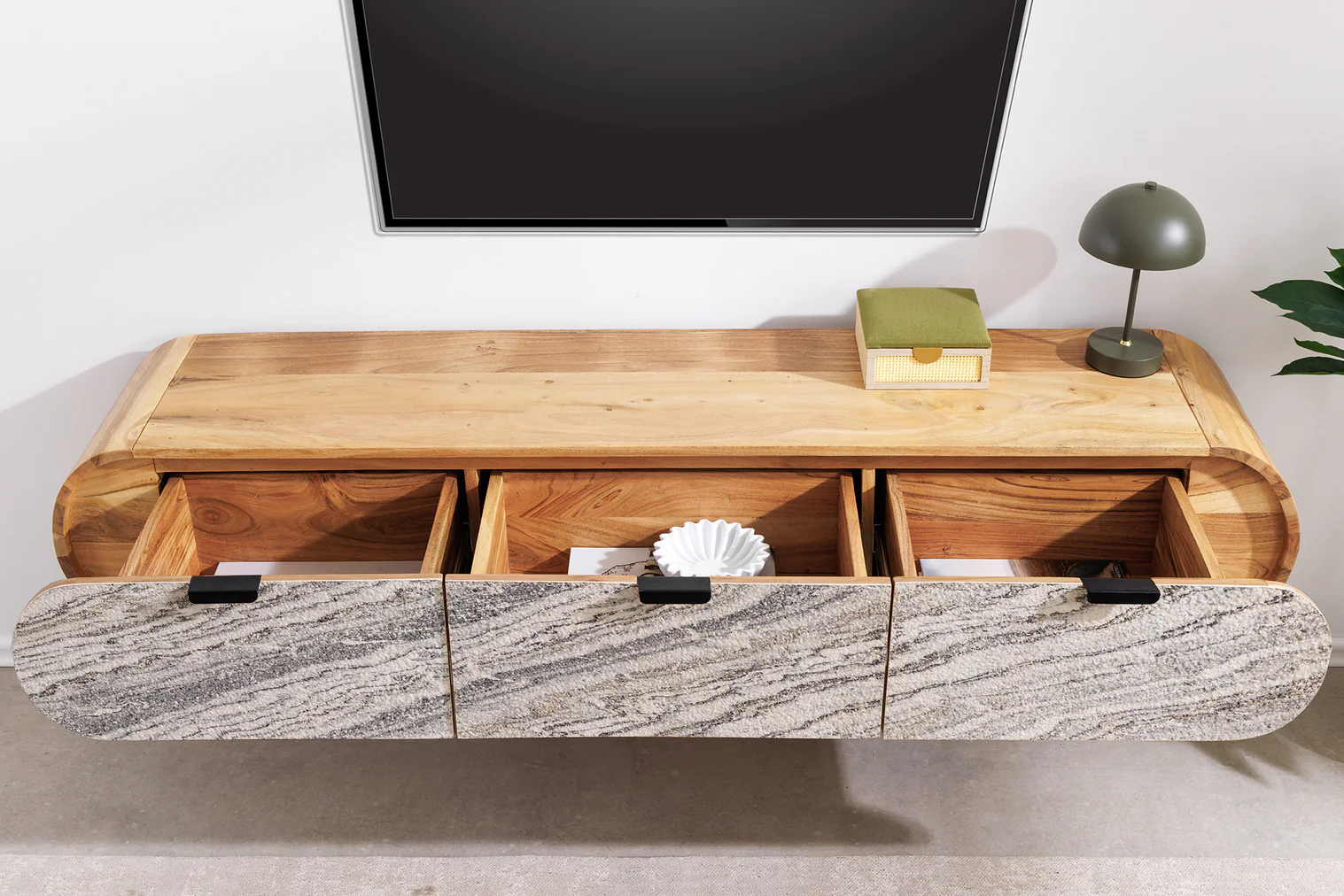 Hladko opracovaný povrch zvýrazňuje unikátnu štruktúru dreva, vďaka čomu je každý TV stolík z masívneho dreva jedinečný originál. Jemne zaoblené hrany a harmonicky zakrivený tvar pripomínajú organické línie prírody, čo dodáva nábytku prirodzenú eleganciu a moderný charakter. Praktický nástenný TV stolík pôsobí vizuálne ľahko a elegantne. Vďaka zavesenému dizajnu vytvára v interiéri vzdušný dojem a zároveň uľahčuje upratovanie pod nábytkom. Tento moderný prvok sa výborne hodí do minimalistických aj moderných interiérov. TV stolík s tromi zásuvkami ponúka dostatok miesta na uloženie elektroniky, diaľkových ovládačov, DVD, herných konzol alebo rôznych doplnkov. Praktické zásuvky pomáhajú udržiavať poriadok v obývačke a zabezpečujú prehľadné usporiadanie všetkých potrebných vecí. Štýlový TV stolík a jeho decentné kovové úchytky dodávajú nábytku moderný nádych a zároveň elegantne dopĺňajú teplý odtieň akáciového dreva.