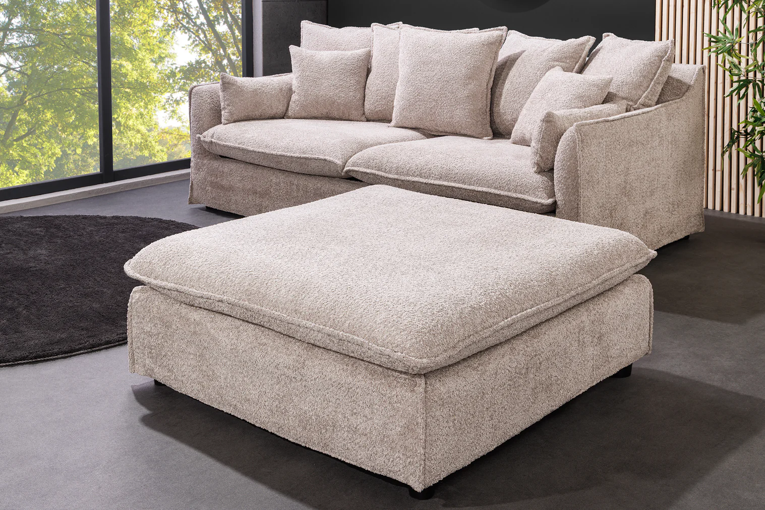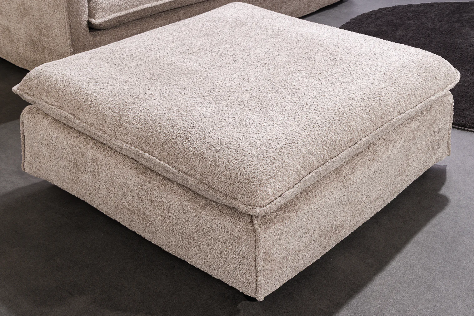 Veľký taburet - podnožka zo série Cloud. Taburet doplní váš obytný priestor a jeho všestranné využitie vám poskytne veľa možností. Nielenže poskytuje pohodlné miesto na odloženie nôh, ale slúži aj ako ďalšie miesto na sedenie, keď prídu hostia. Či už je umiestnená vedľa pohovky alebo voľne stojaca v miestnosti, táto veľká čalúnená taburetka sa dokonale prispôsobí vášmu interiéru. Pohodlné polstrovanie v kombinácii s mäkkým bouclé poťahom zaisťuje príjemný zážitok zo sedenia. Veľká taburetka, ktorá dokonale dopĺňa vašu pohovku, prináša štýlovú aktualizáciu do vášho interiéru. Nie je však len do obývačky – táto taburetka s príjemným poťahom je výrazným doplnkom aj v spálni alebo šatni. Ľahko udržiavateľný poťah je robustný, odolný a jeho povrch dodá vášmu domovu jedinečný nádych.