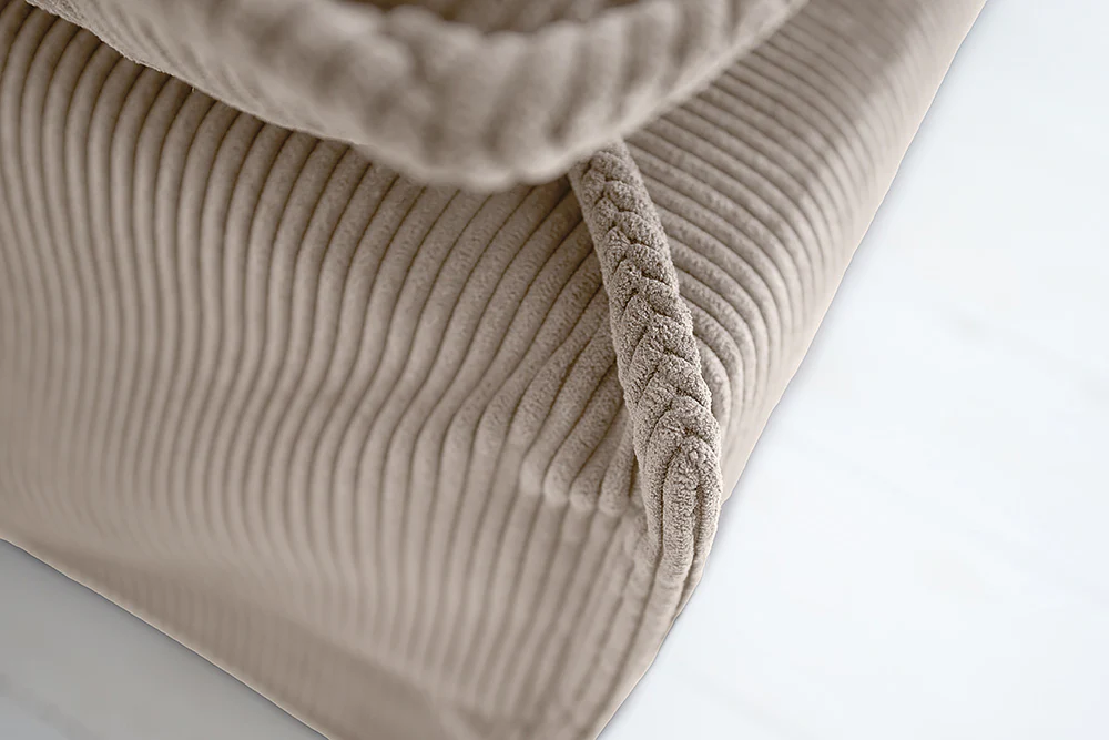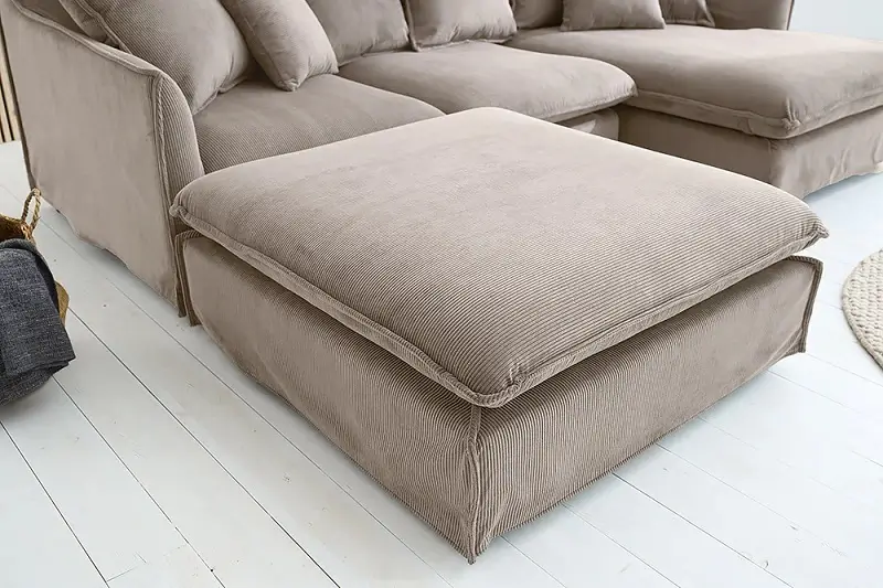 Veľký taburet - podnožka zo série Cloud. Taburet skutočne doplní váš obytný priestor – všestranné využitie v prevedení zo sivého až Taupe zafarbeného manšestru. Nielenže poskytuje pohodlné miesto na odloženie nôh, ale slúži aj ako ďalšie miesto na sedenie, keď prídu hostia. Či už je umiestnená vedľa pohovky alebo voľne stojaca v miestnosti, táto veľká čalúnená taburetka sa dokonale prispôsobí vášmu interiéru. Pohodlné polstrovanie v kombinácii s mäkkým manšestrovým poťahom zaisťuje príjemný zážitok zo sedenia. Veľká taburetka, ktorá dokonale dopĺňa vašu pohovku, prináša štýlovú aktualizáciu do vášho interiéru. Nie je však len do obývačky – táto manšestrová taburetka s príjemným poťahom je výrazným doplnkom aj v spálni alebo šatni. Ľahko udržiavateľný manšestrový poťah je robustný, odolný a jeho textúrovaný povrch dodá vášmu domovu jedinečný nádych.